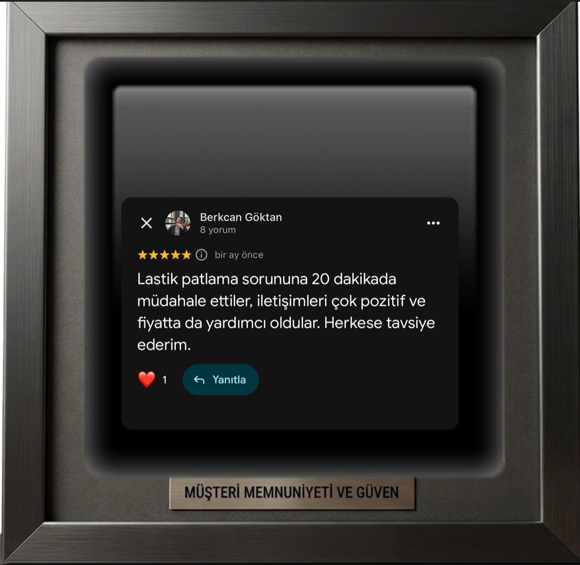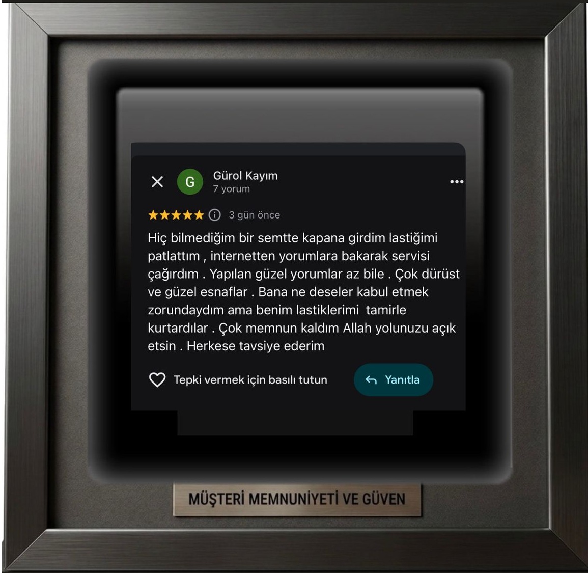 Patlayan lastiğimi hemen kapımda onarımını gerçekleştirdiler. Kaliteli ve hızlı hizmetleriniz için teşekkürler.